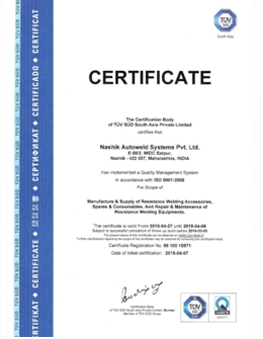 Established in 2001, we Nashik Autoweld Systems Pvt. Ltd are an ISO 9001:2008 certified company engaged in manufacturing and supplying of resistance welding products. Our company engineers cold formed cap tips, spot welding electrodes, laminated shunt, flat shunts, PSW Gun, Seam welding wheels, single conductor water cooled cable, Kickless Cables, Stud welding collets & Receivers, Flexible jumpers, Spot welding fixtures, Copper chromium plates, & Spot welding gun accessories.
